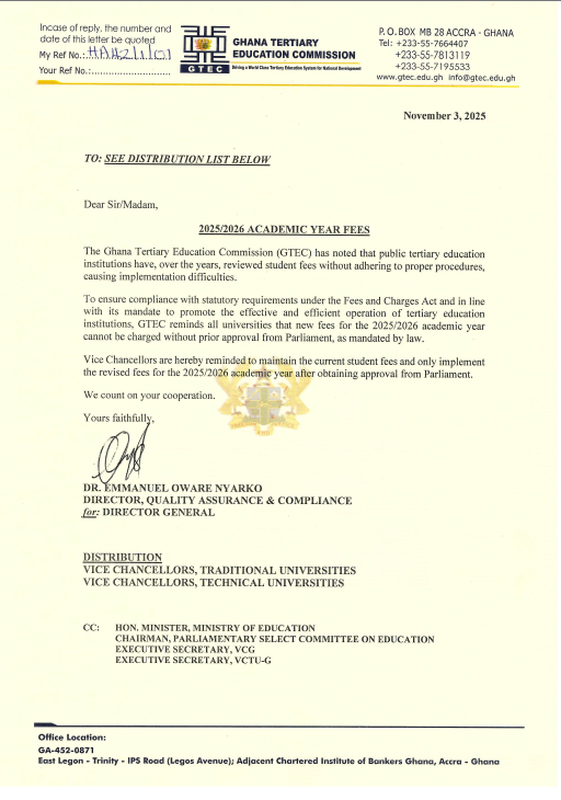 In a letter dated Monday, November 3, 2025, and addressed to Vice Chancellors of traditional and technical universities, GTEC said it had observed that “public tertiary education institutions have, over the years, reviewed student fees without adhering to proper procedures, causing implementation difficulties.”