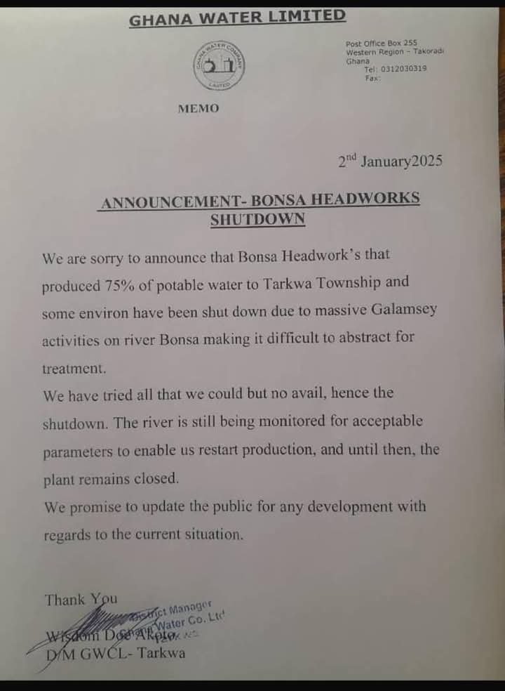 The Ghana Water Company Limited says it has shut down Bonsa Headwork in Tarkwa due to illegal mining also known as galamsey activities.