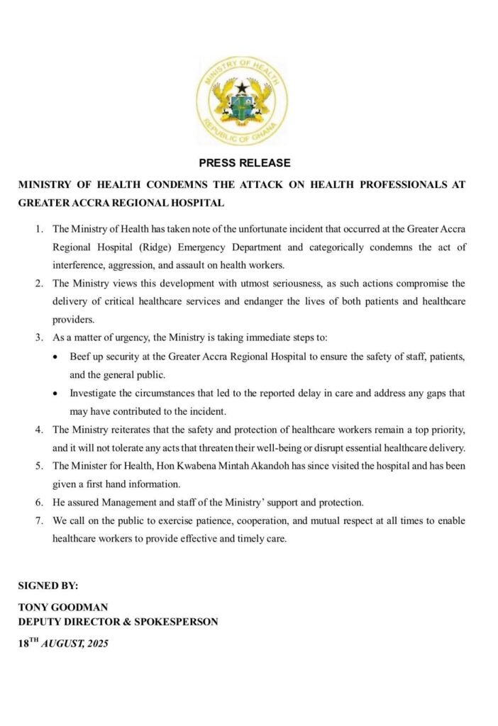 The Management of Ridge Hospital has strongly condemned the assault, cautioned the public against taking videos or photographs of patients and clinicians without consent, and reassured Ghanaians of its continuous commitment to providing quality and timely healthcare.