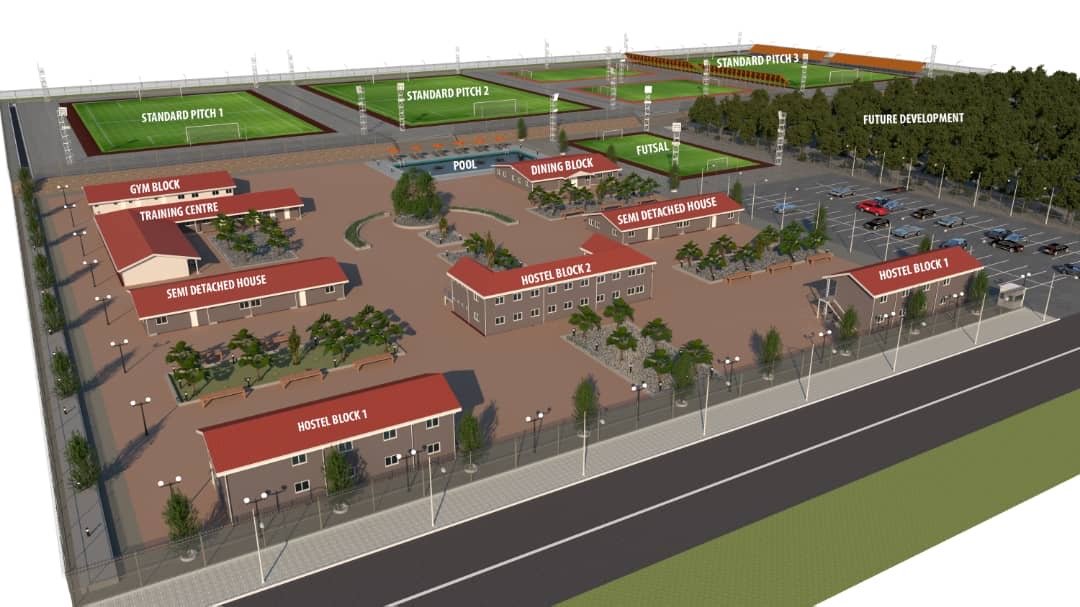 The 20 acre ultra modern sporting academy will have dormitories to house players, 3 pitches, mini stadium, volleyball, basketball, gymnasium, swimming pool, staff residence, training centres etc.