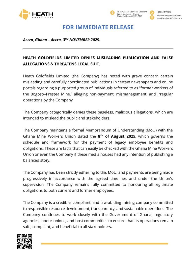 Heath Goldfields Limited has refuted media reports alleging non-payment of arrears, mismanagement, and irregular operations at the Bogoso–Prestea Mine.