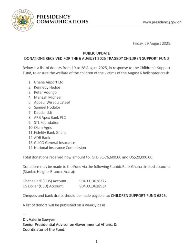The Children’s Support Fund established in memory of the eight victims of the August 6 helicopter crash in the Ashanti Region has now accrued GH¢3,576,600 and US$20,000.