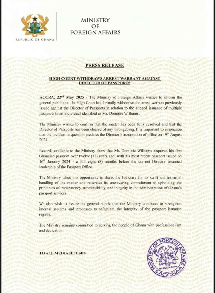 The High Court has officially withdrawn the arrest warrant issued against the Director of Passports in connection with the alleged issuance of multiple Ghanaian passports to a man identified as Mr. Dominic Williams.
