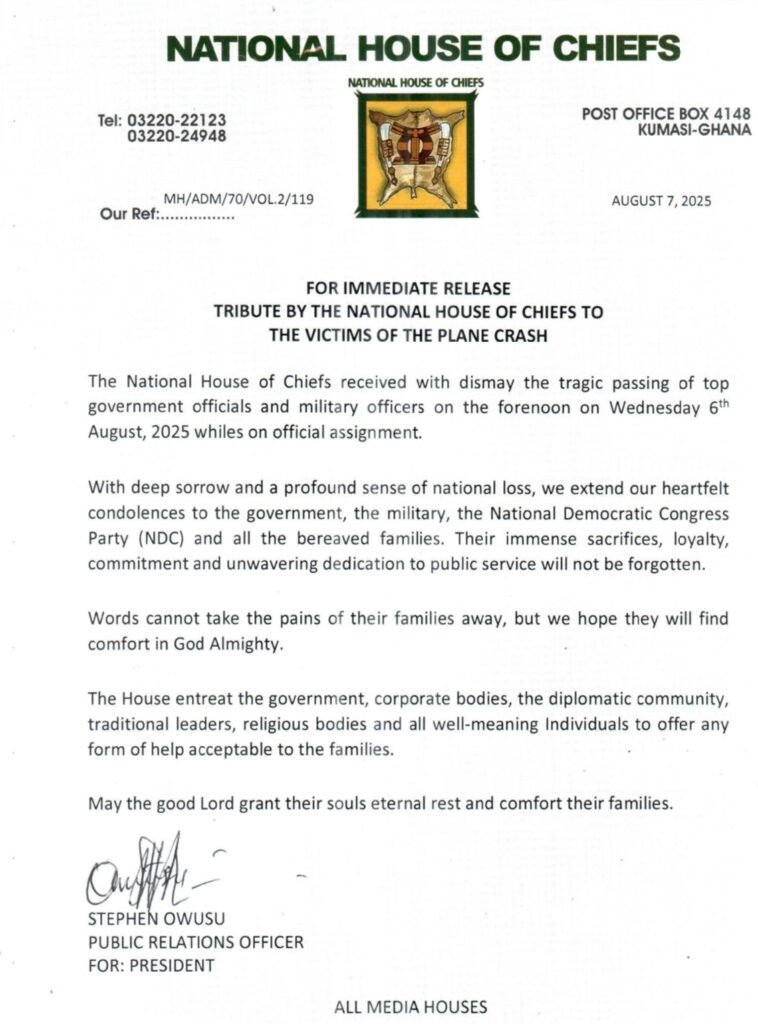 The National House of Chiefs has expressed profound sorrow over the tragic military helicopter crash that claimed the lives of eight individuals, including two cabinet ministers, senior military officers, and top government officials on Wednesday, August 6, 2025.