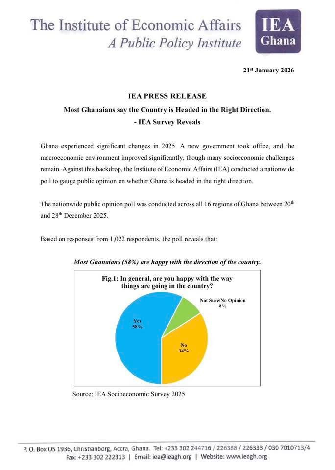 A 2025 Socioeconomic survey by the Institute of Economic Affairs (IEA) indicates that a majority of Ghanaians hold a positive view about the direction of the country, reflecting growing public confidence amid recent macroeconomic improvements.