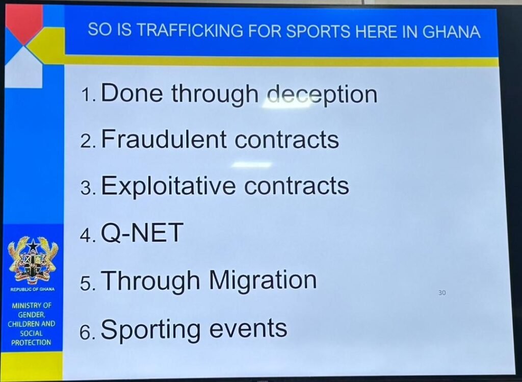 At a stakeholder engagement and training workshop for sports journalists on trafficking, the Director of the Human Trafficking Secretariat, Anena Annobea Asare, described sports trafficking as an emerging threat requiring urgent national attention.