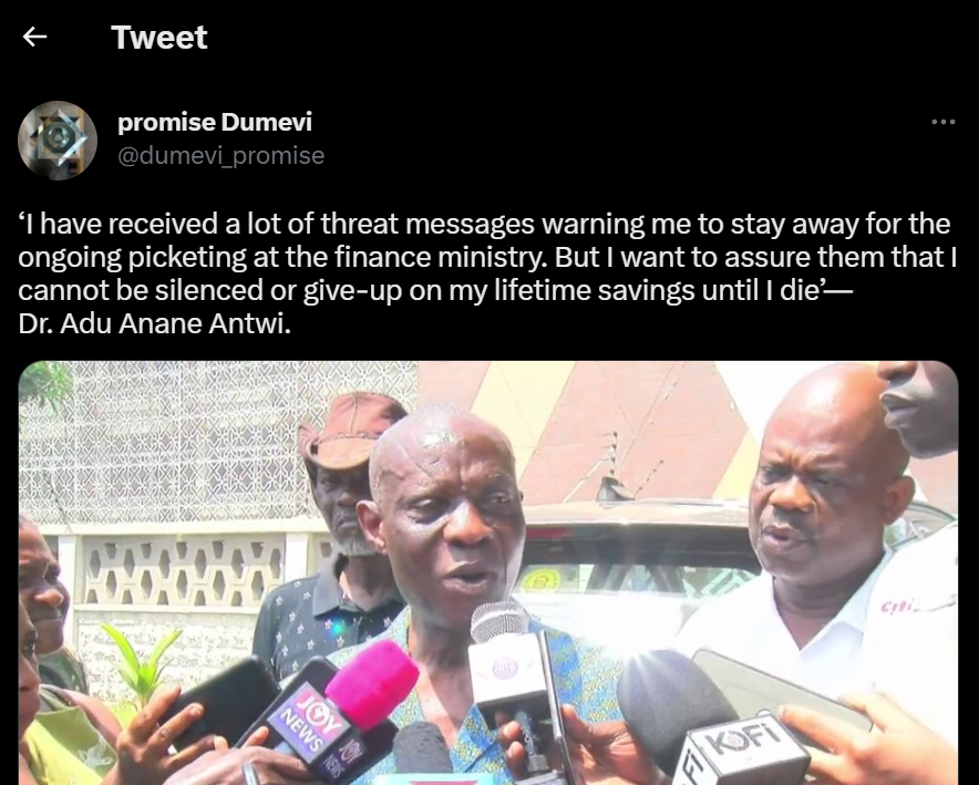 “My attention has been drawn to a tweet by one Promise Dumevi on 16th February 2023, circulating on social media attributing the following statement to me: I have received a lot of threat messages warning me to stay away from the ongoing picketing at the finance ministry. But I want to assure them that I cannot be silenced or give-up on my lifelong savings until I die,” Mr. Anane Antwi stated in a disclaimer.