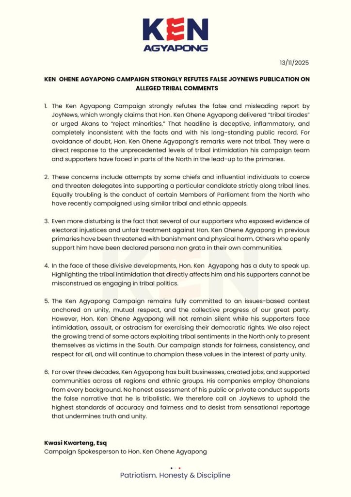 The campaign team of Presidential hopeful, Ken Ohene Agyapong, has strongly refuted a JoyNews publication claiming he made tribal comments urging Akans to reject minorities. The team says the report is false, misleading and inconsistent with both the facts and Mr. Agyapong’s long-standing public record.