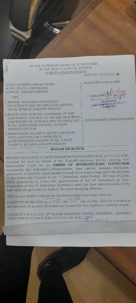 A legal challenge has been mounted against the reappointment of Professor Rita Akosua Dickson as Vice Chancellor of Kwame Nkrumah University of Science and Technology (KNUST).
