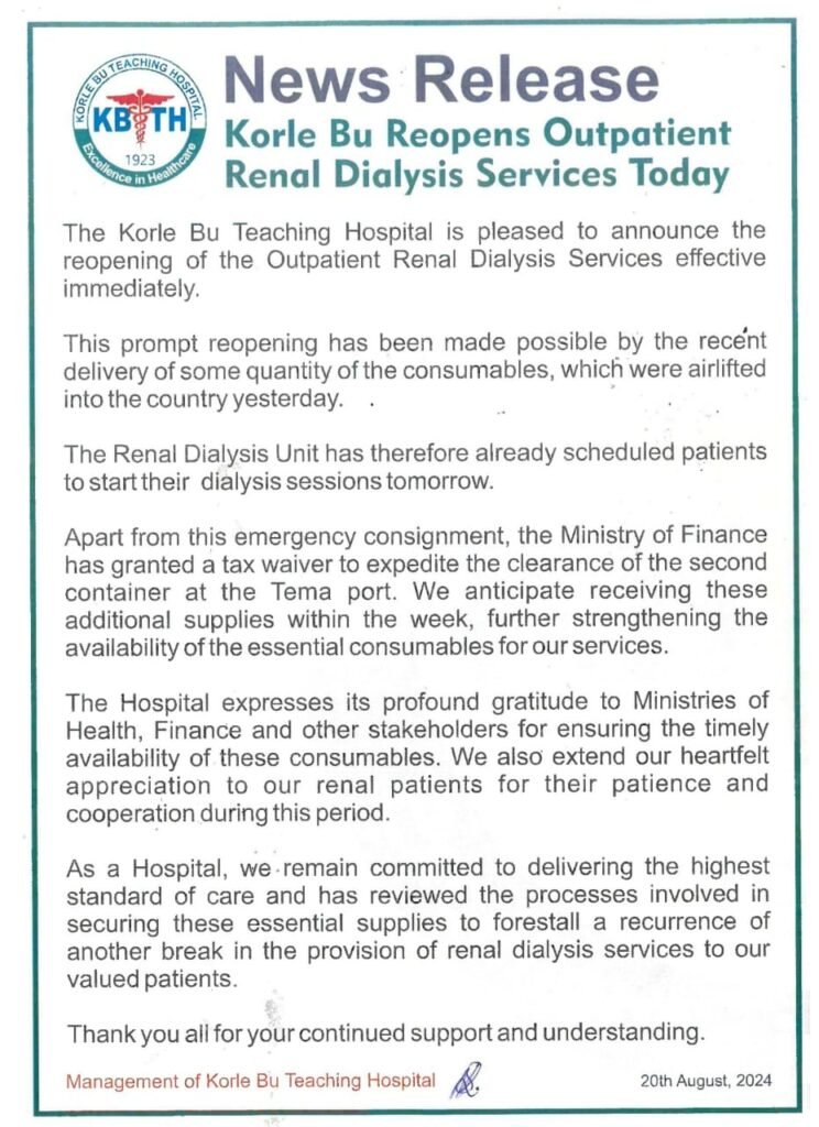 The Korle Bu Teaching Hospital has announced the reopening of the Outpatient Renal Dialysis Services effective immediately.