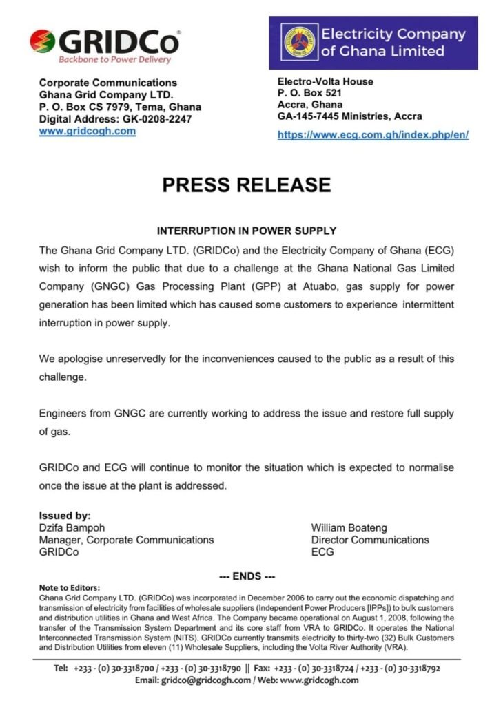In a joint statement, GRIDCo and ECG explained that the issue has significantly reduced the supply of gas, which is impacting power generation. “Due to a challenge at the Ghana National Gas Limited Company Gas Processing Plant at Atuabo, gas supply for power generation has been limited, causing some customers to experience intermittent interruptions in power supply,” the statement revealed.