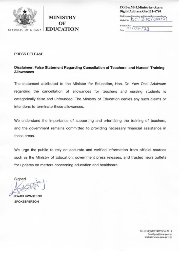 This comes on the back of reports that the Minister of Education, Dr. Yaw Osei Adutwum has said the government is unable to afford allowances for Teachers and Nurses Trainees.