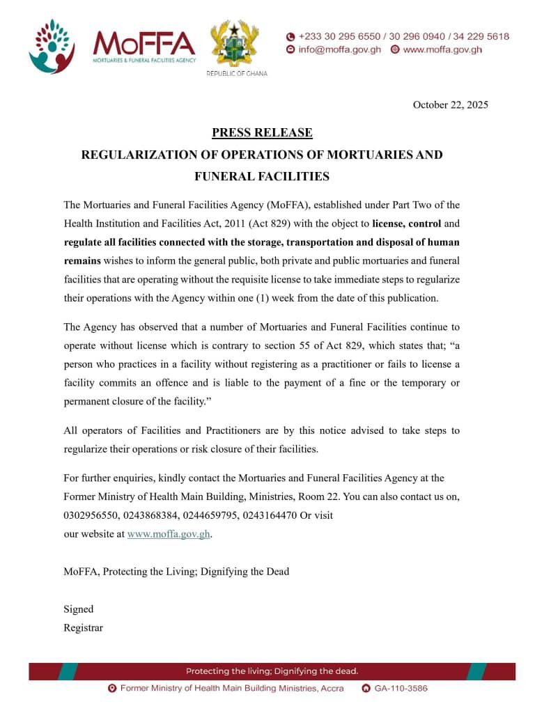 In a statement dated October 22, 2025, the agency said it had observed with concern that several mortuaries and funeral homes continue to operate illegally, contrary to the Health Institutions and Facilities Act, 2011 (Act 829).