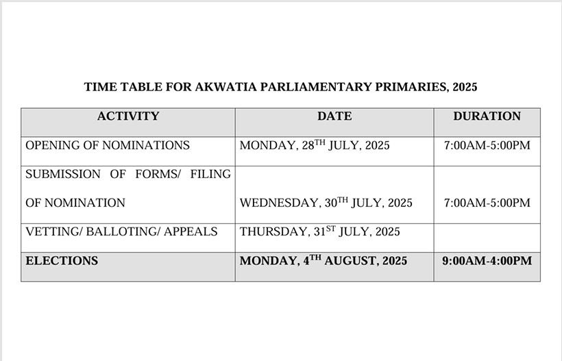 The National Democratic Congress (NDC) has scheduled Monday, August 4, 2025, for its parliamentary primaries in the Akwatia Constituency in the Eastern Region.