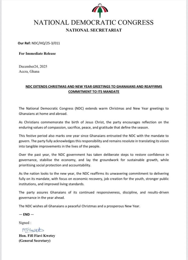 The National Democratic Congress (NDC) has extended Christmas and New Year greetings to Ghanaians, using the occasion to reaffirm its commitment to governance and national development.