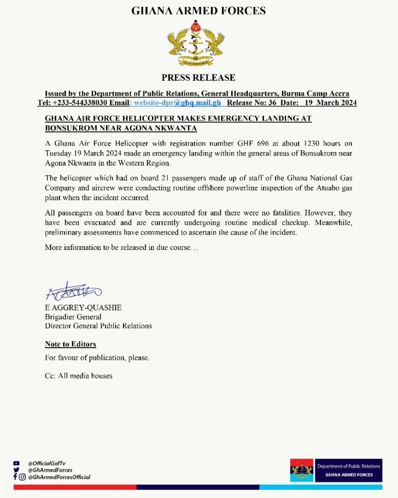 In a statement signed by the Director General Public Relation, E. Aggrey-Quashie disclosed that the helicopter had 21 passengers.