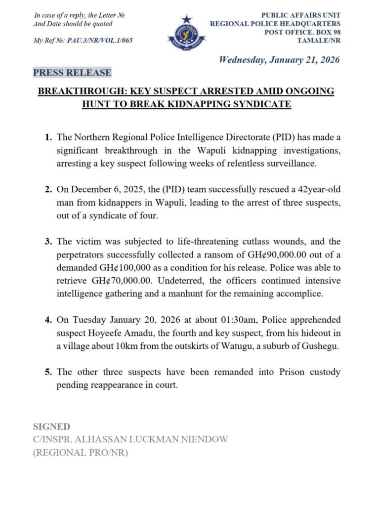 In a statement dated Wednesday, January 21, 2026, the Police confirmed the apprehension of Hoyeeefe Amadu, believed to be the fourth and last member of the syndicate involved in the December 6, 2025 abduction of a 42-year-old man in Wapuli.