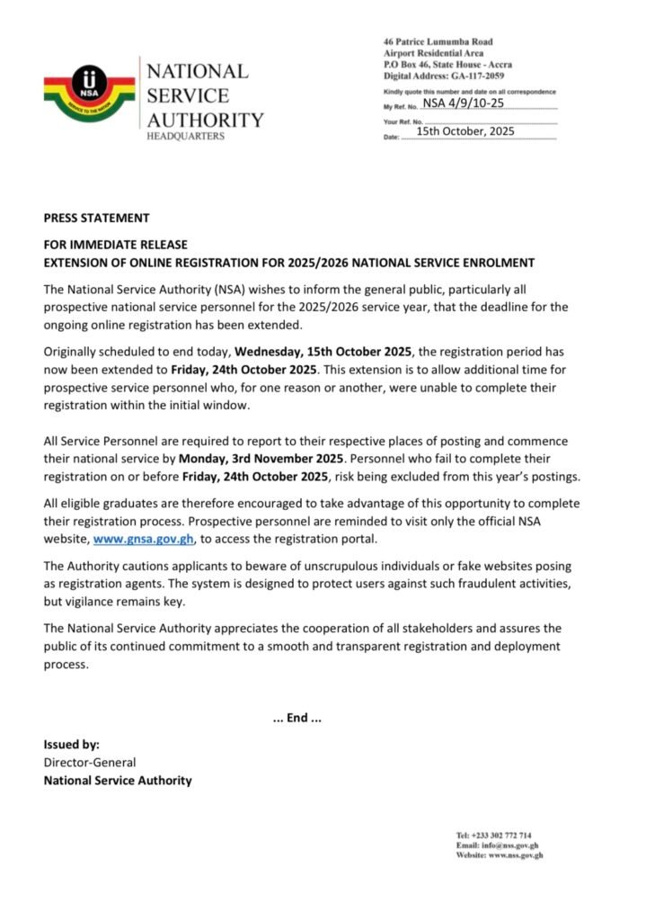 The National Service Authority (NSA) has announced an extension of the deadline for the ongoing online registration of prospective national service personnel for the 2025/2026 service year.