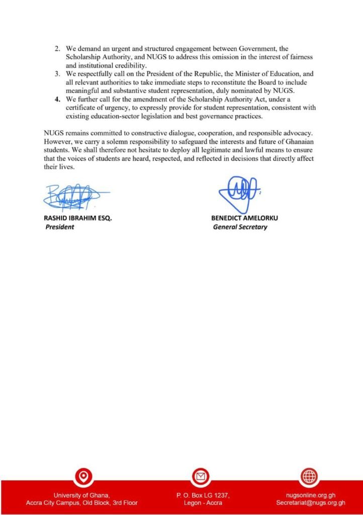 It also urged the President and Minister of Education to reconstitute the board to include meaningful student representation and amend the Scholarship Authority Act to explicitly guarantee such representation.