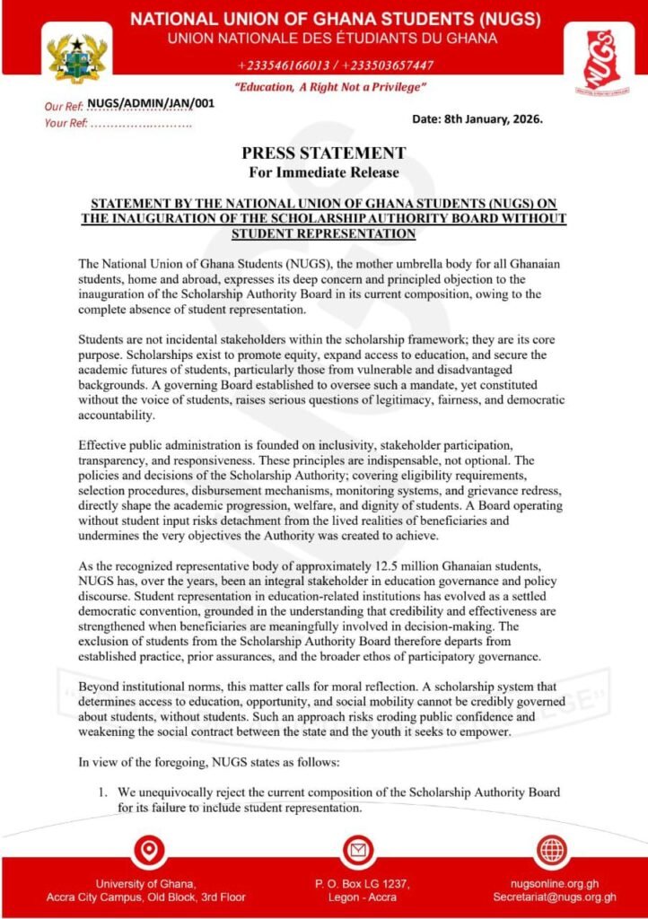 The National Union of Ghana Students (NUGS) has expressed strong opposition to the recent inauguration of the Scholarship Authority Board, citing the complete absence of student representation.