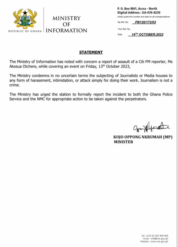 The Ministry condemns in no uncertain terms the subjecting of Journalists or Media houses to any form of harassment, intimidation, or attack simply for doing their work. Journalism is not a crime,” Mr. Oppong Nkrumah explained in a statement.