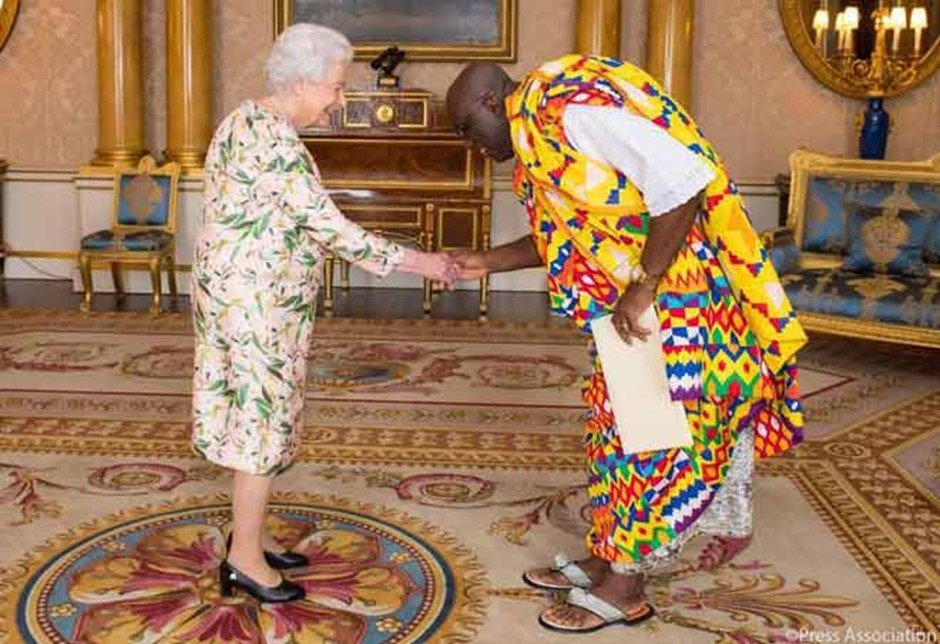 The Queen, Elizabeth II, of the United Kingdom of Great Britain and Northern Ireland and His Excellency Papa Owusu-Ankomah, during the presentation of his credentials in 2017.