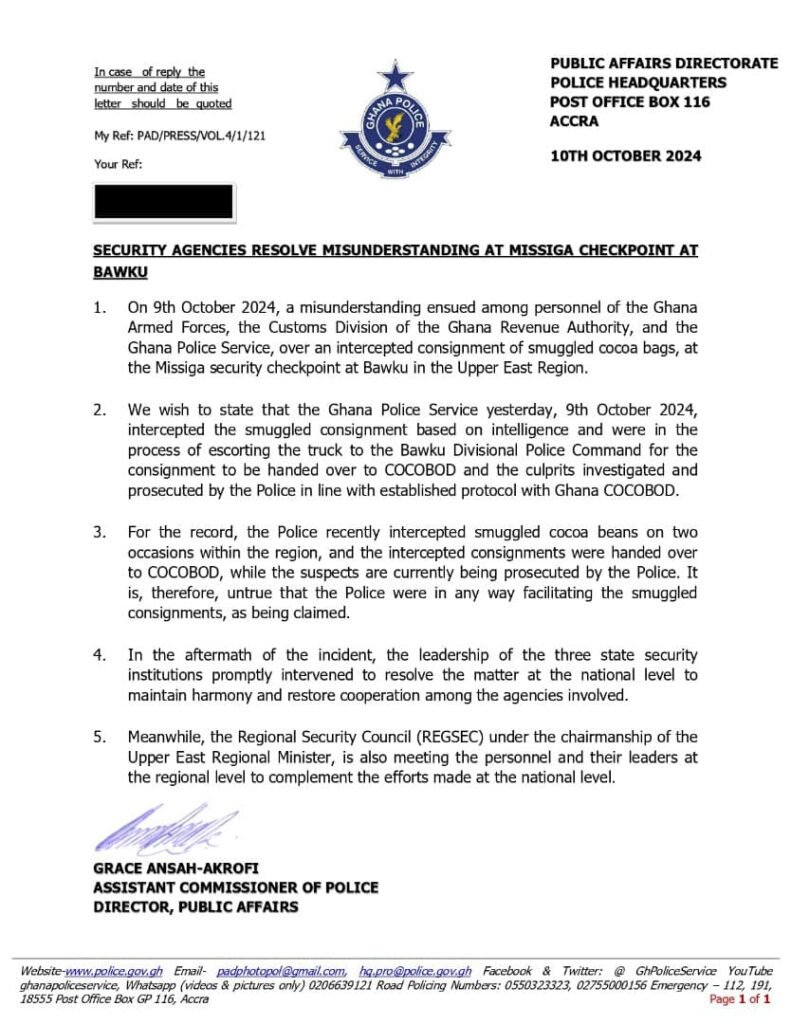 The Ghana Police Service on Wednesday 9th October 2024 arrested some cocoa smugglers at Bawku in the East Region.