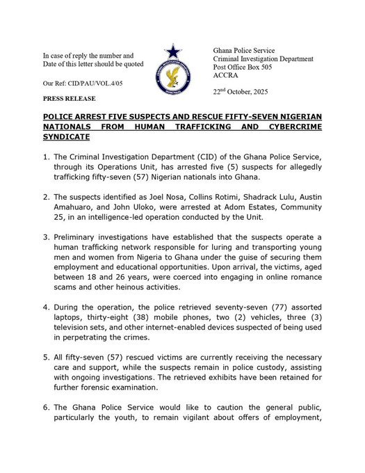 The Criminal Investigation Department (CID) of the Ghana Police Service has successfully dismantled a human trafficking and cybercrime syndicate, arresting five suspects and rescuing 57 Nigerian nationals,