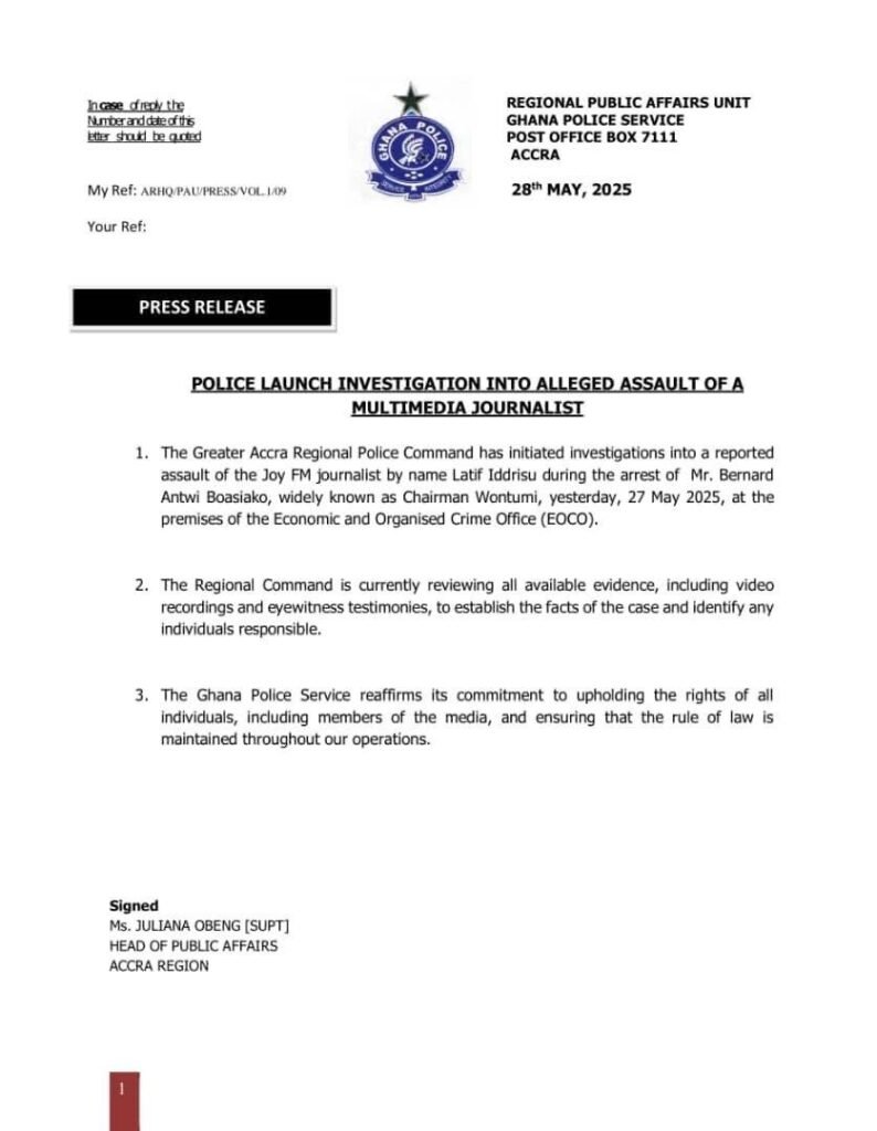 The Greater Accra Regional Police Command has launched an investigation into an alleged assault on Joy FM journalist, Latif Iddrisu, which reportedly occurred during the arrest of Mr. Bernard Antwi Boasiako, popularly known as Chairman Wontumi.