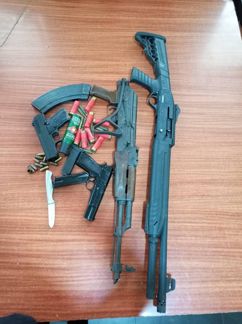 Exhibits retrieved from the crime scene include: one (1) AK47 Assault rifle, ten (10) rounds of AK47 ammunition, one (1) pump action gun with nine (9) rounds of BB cartridges, two (2) pistols with ten (10) rounds of 9mm ammunition, one (1) unregistered Toyota Tacoma pickup, four (4) motorbikes, three (3) of which are unregistered, a knife and a pepper spray.