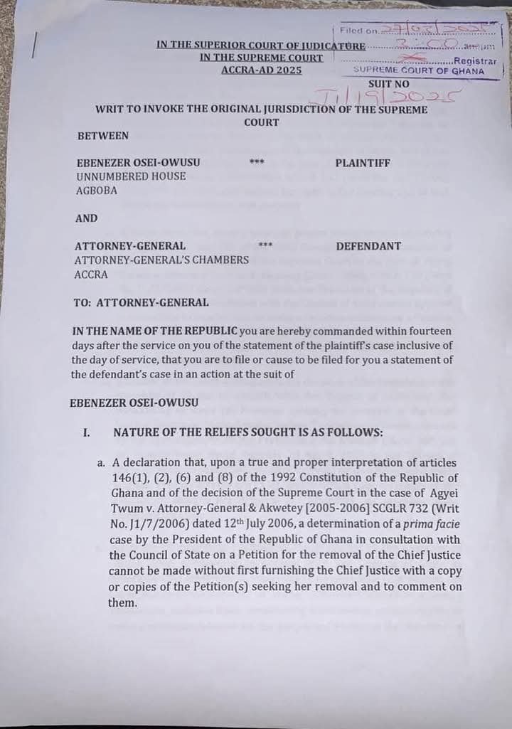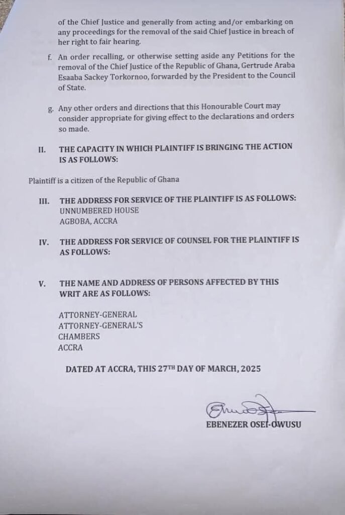 “An order of the Court setting aside the decision of the President of the Republic of Ghana to consult with the Council of State and the forwarding of three (3) Petitions seeking the removal of the Chief Justice, Gertrude Araba Esaaba Sackey Torkornoo as communicated by the Spokesperson to the President, Felix Kwakye Ofosu, MP, per his release/letter dated Tuesday 25 March 2025 to the Council of State as being unconstitutional, null and void same having been made without first furnishing the Chief Justice with a copy or copies of the Petition (s) seeking her removal and affording her opportunity to comment on same,” the Plaintiff stated.