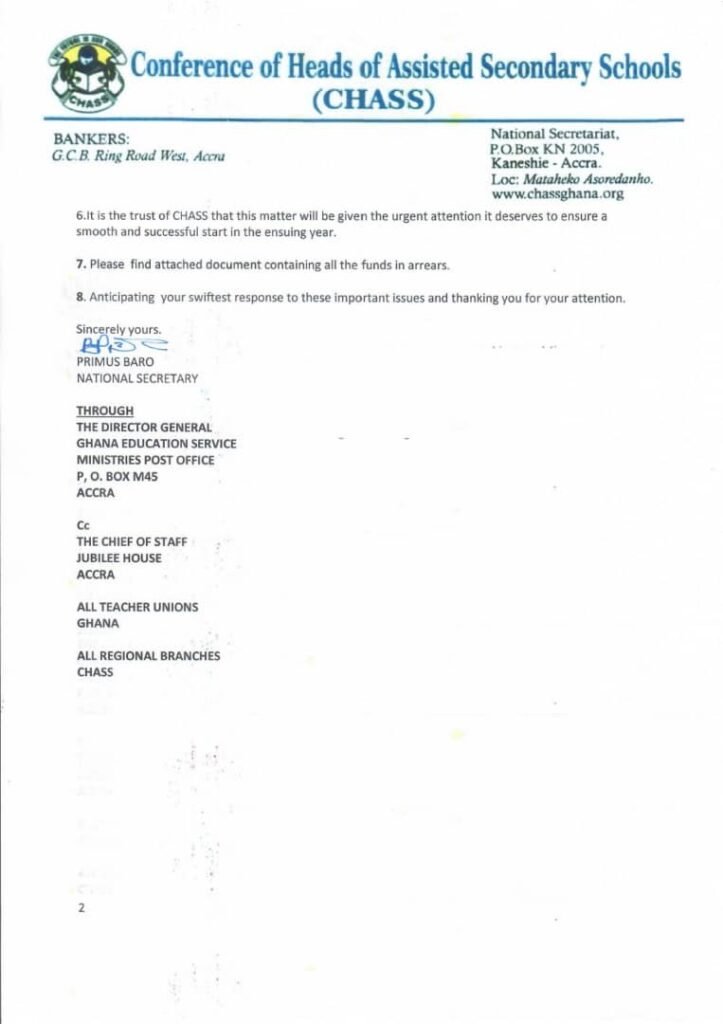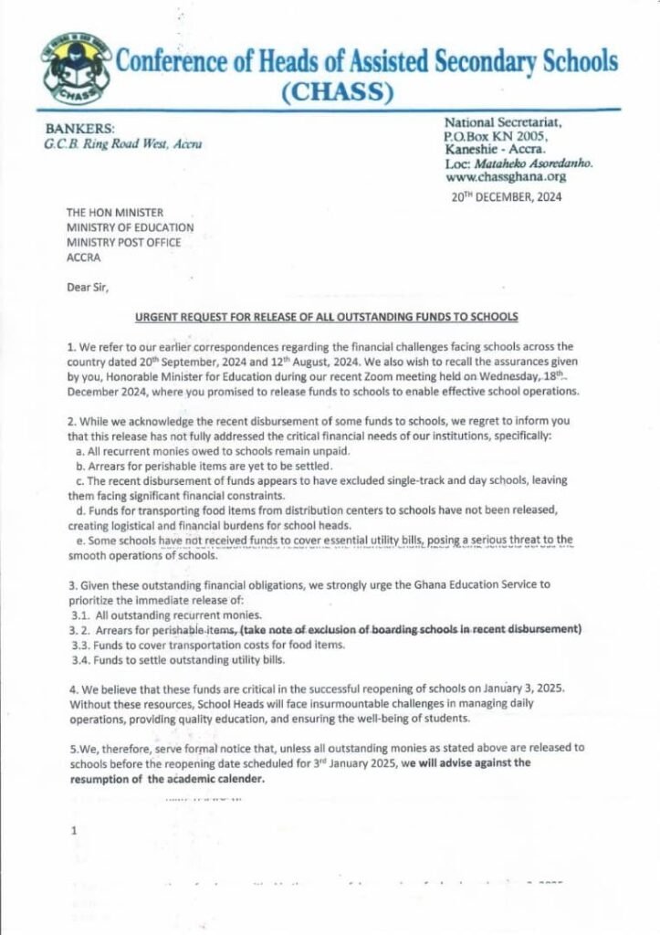 In the statement on Monday, December 23, CHASS recalled the Minister’s commitment made during a Zoom meeting on December 18, 2024, where the Minister promised the release of funds to facilitate smooth school operations.