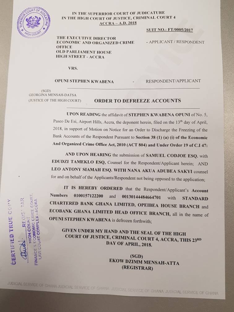 An Accra High court has directed the Economic and Organised Crime Office (EOCO) to lift the freeze on the bank accounts of Dr. Stephen Opuni.