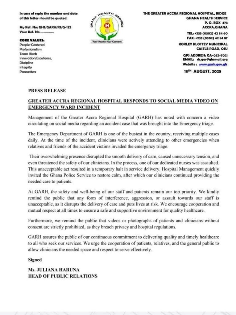 The hospital further reassured Ghanaians of its continuous commitment to providing quality and timely healthcare, while urging relatives of patients and the general public to cooperate with clinicians and give them the needed space and respect to work effectively.