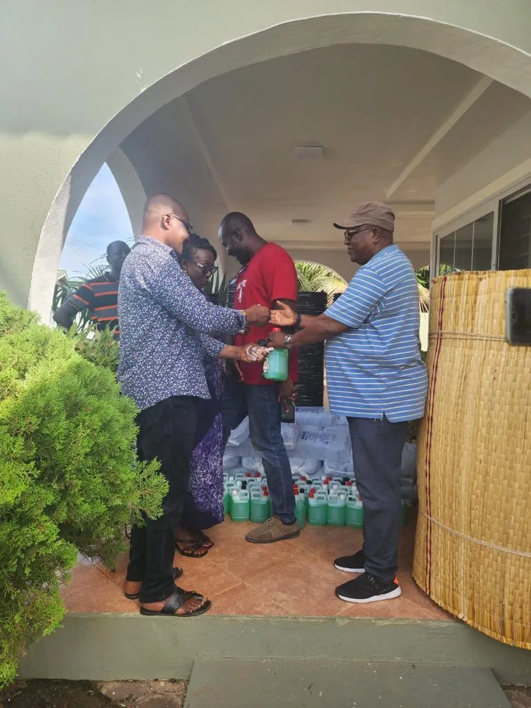 The items donated were: 300 bags of Satchet water, 300 mats, 90 gallons of liquid soap 300 buckets, and 90 pails.