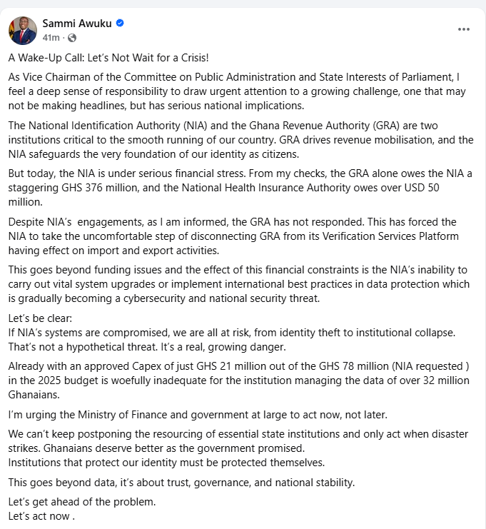 In a Facebook post, Mr. Awuku said the development signals not just a fiscal disagreement, but a deeper governance failure that risks crippling the country’s digital identity infrastructure and undermining inter-agency cooperation.