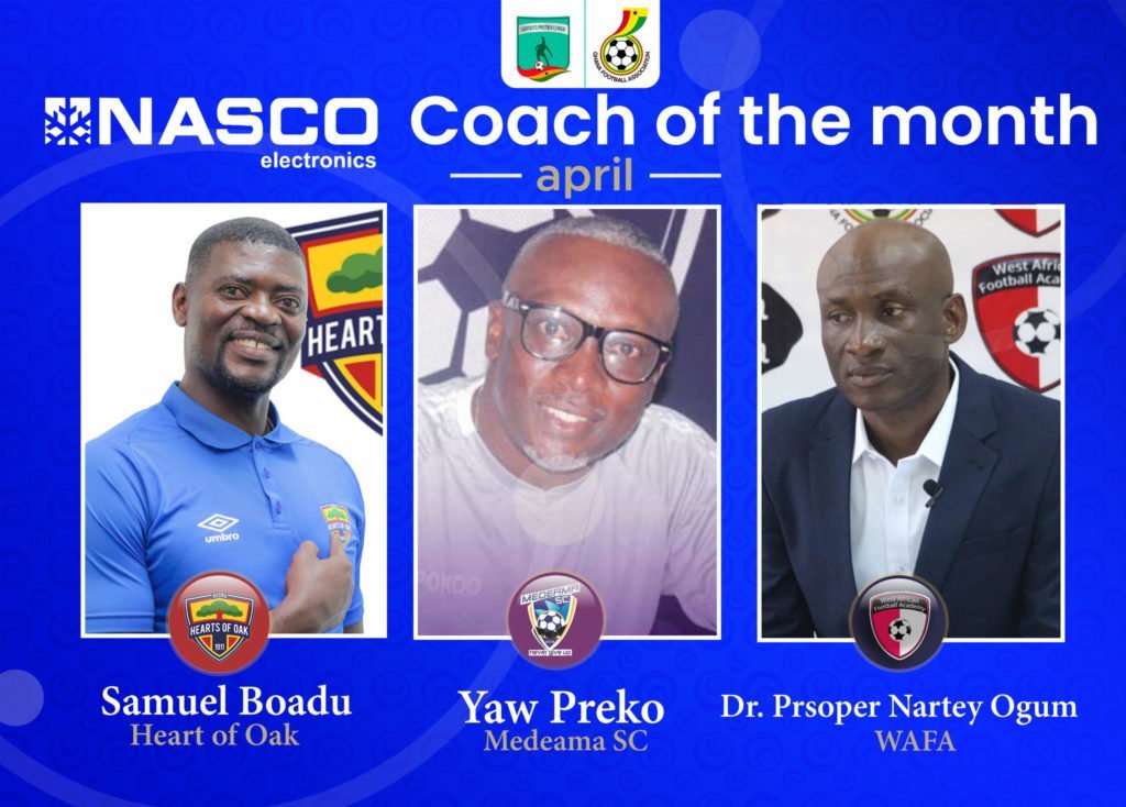 Three Coaches Yaw Preko, Samuel Boadu, and Dr. Prosper Narteh Ogum have been nominated for coach of the Month for April.
