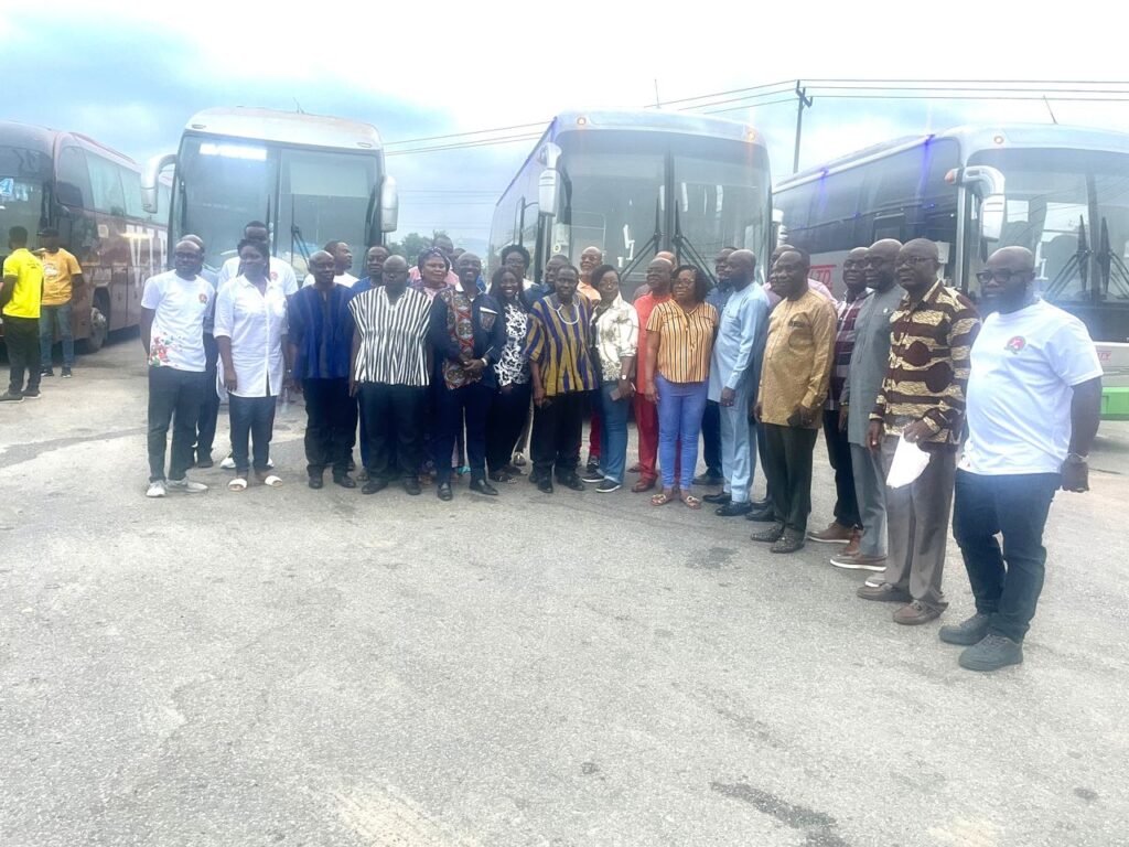 Enroute their destination, leaders of Specified Entities were pictured seated in STC buses which conveyed them from Accra.