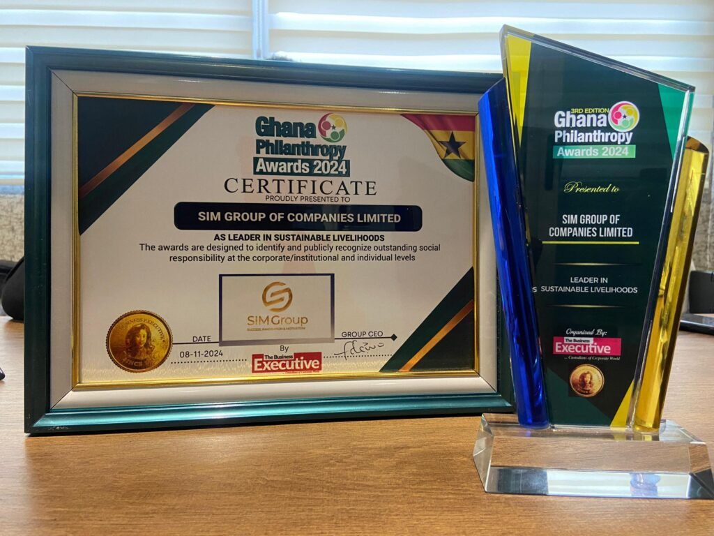 SIM Group of Companies Ltd. received the esteemed “Leader in Sustainable Livelihood” award from The Business Executive at the 2024 Ghana Philanthropy Awards.