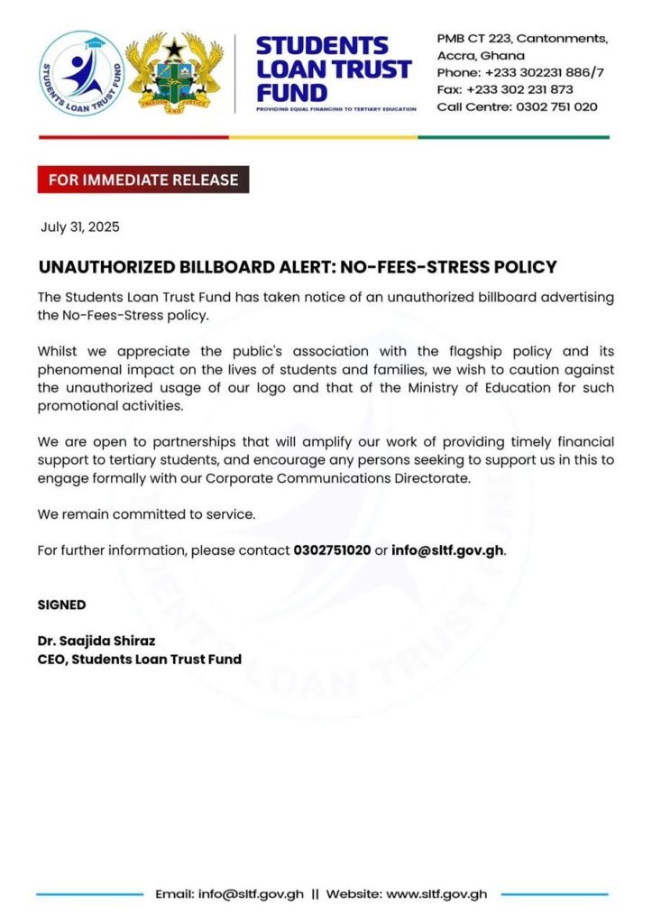 The Students Loan Trust Fund (SLTF) has issued an alert over the unauthorized use of its branding on a billboard advertising the popular “No-Fees-Stress” policy.