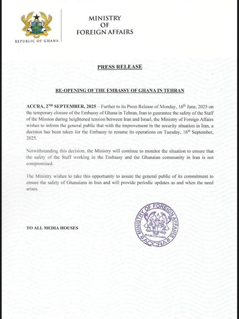 Ghana’s Foreign Affairs Ministry has announced the reopening of its embassy in Tehran on September 16, 2025, following improved security conditions after months of closure.
