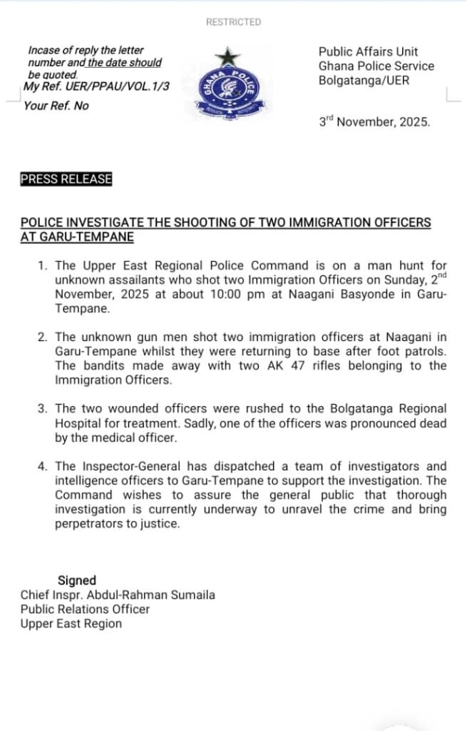 The Ghana Police Service has launched a full-scale investigation into the fatal shooting of two Immigration Officers in the Tempane District of the Upper East Region.
