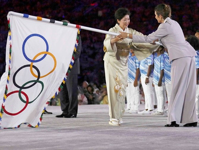 2016 Rio Olympics - Closing ceremony - Maracana - Rio de Janeiro, Brazil - 21/08/2016. Tokyo governor Yuriko Koike takes the Olympic flag on stage. REUTERS/Stefan Wermuth FOR EDITORIAL USE ONLY. NOT FOR SALE FOR MARKETING OR ADVERTISING CAMPAIGNS. - RTX2MGLS