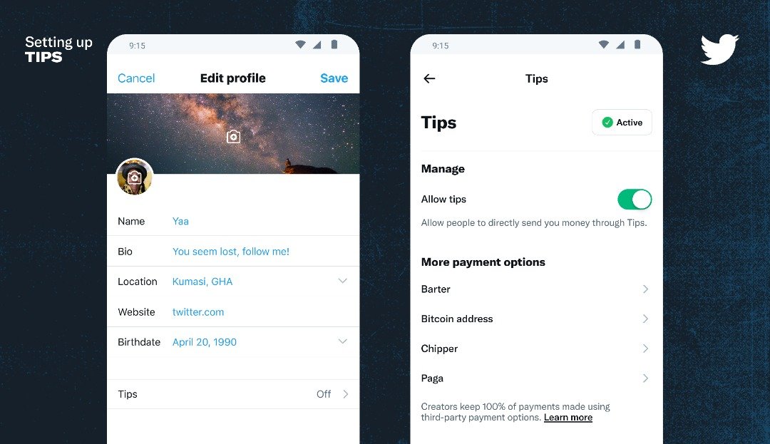 In May 2021, Twitter started experimenting with this feature with a small group of people on the platform, including journalists, creators, and more. Since then, Tips has become available on iOS and Android, and to everyone who is 18+ on Twitter, including in Ghana and across the continent. It is a new way to monetise on Twitter and enables people on the service to send and receive funds as a token of appreciation.
