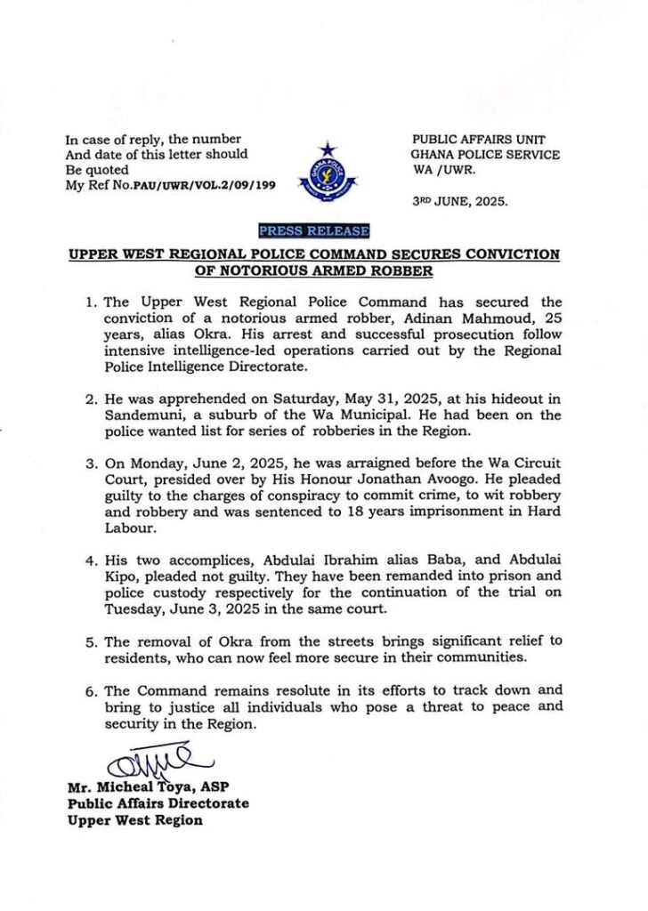 The Wa Circuit Court in the Upper West Region has jailed a notorious armed robber of Adinan Mahmoud, alias “Okra,” to 18 years imprisonment with hard labour.