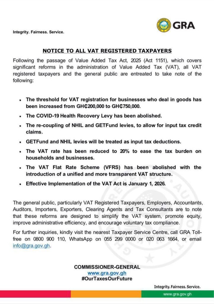 The Ghana Revenue Authority (GRA) has announced sweeping changes to the country’s Value Added Tax (VAT) regime, set to take effect from January 1, 2026, following the passage of the Value Added Tax Act, 2025 (Act 1151).