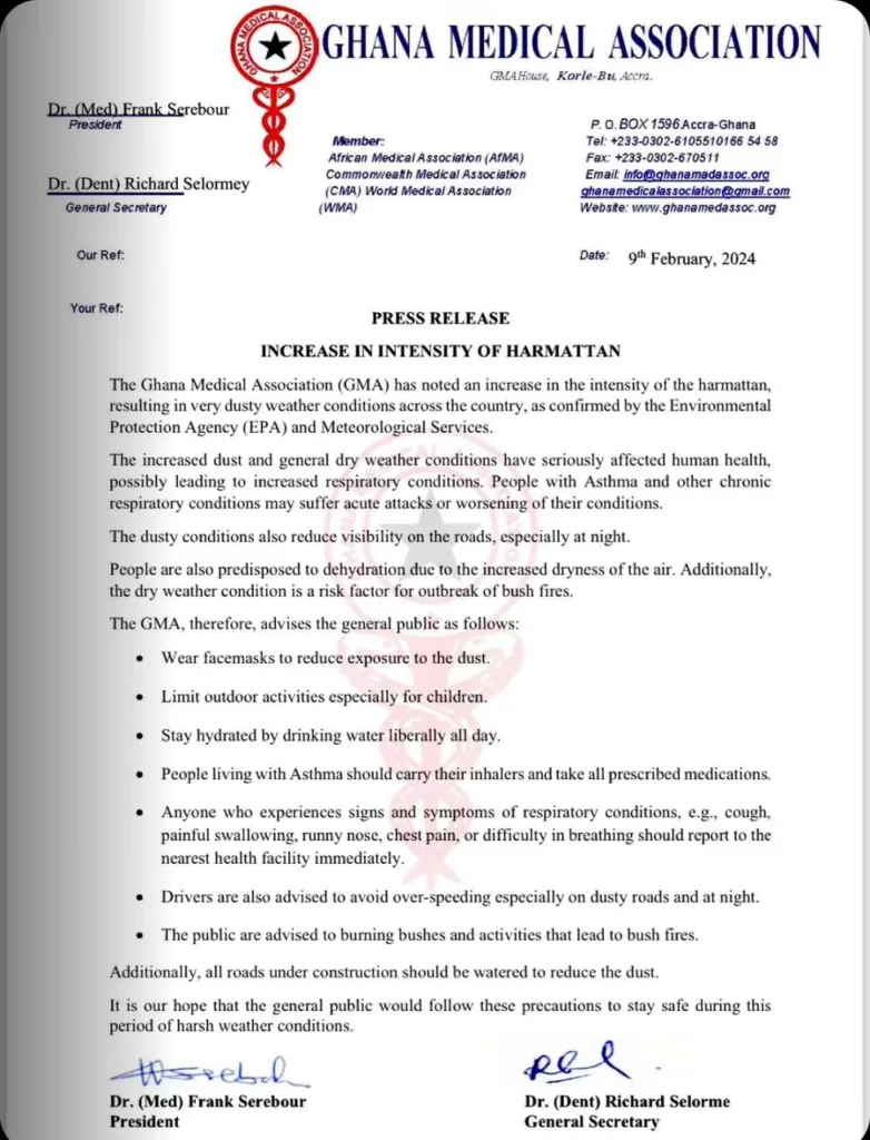 This advice comes in response to the heightened intensity of harmattan, leading to extremely dusty weather conditions nationwide, as confirmed by both the Environmental Protection Agency (EPA) and Meteorological Services.
