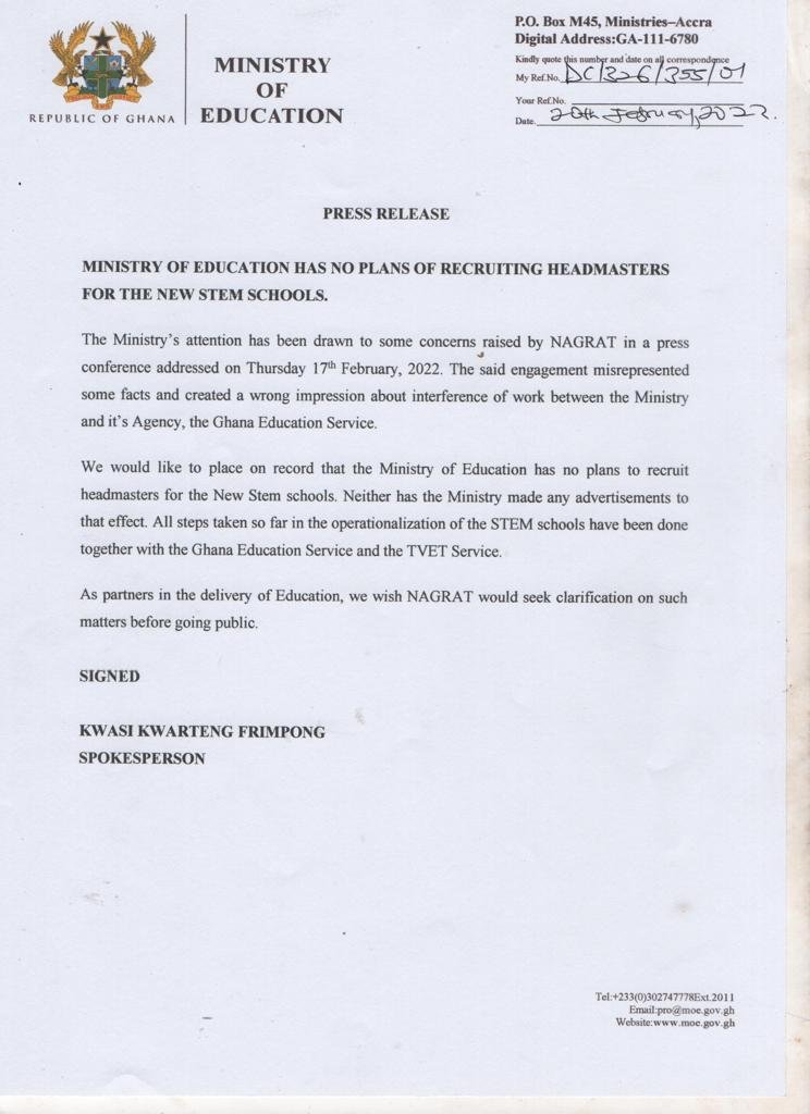 The Ministry of Education has debunked claims by the National Association of Graduate Teachers (NAGRAT) that it has embarked on a recruitment drive for head teachers to fill STEM schools across the country.